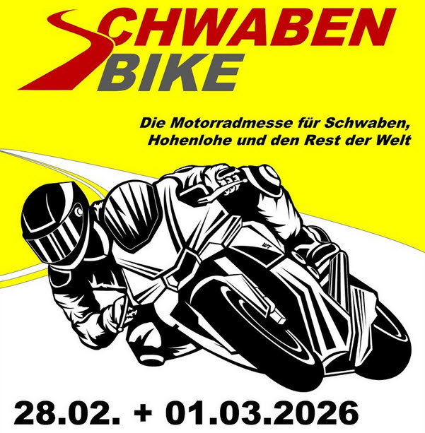 SCHWABENBIKE 2026 Die Messe findet vom 28.02. bis 01. März 2026 erstmals in der Arena Hohenlohe in Ilshofen statt. Die SCHWABENBIKE ist die regionale Motorradmesse zwischen Stuttgart und Nürnberg, auf der die TOP Marken der Szene vertreten sind. Am Samstag 28.02.2026 und am Sonntag 01.03.2026 präsentieren Vertragshändler der Marken Aprilia, Beta, BMW, Brixton, CF Moto, […]